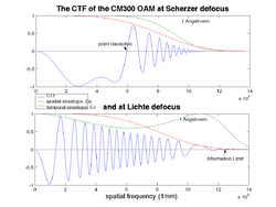 where umax is the maximum transmitted spatial frequency. For the CM300 with an information limit of 0.8 Å Lichte defocus lies at −272 nm.