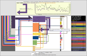 Clickpath Analysis with referring pages on the left and arrows and rectangles differing in thickness and expanse to symbolize movement quantity.