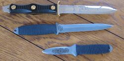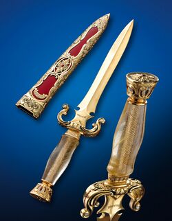 A dagger is a fighting knife with a very sharp point and usually one or two sharp edges, typically designed or capable of being used as a cutting or thrusting weapon.[1][2] Daggers have been used throughout human history for close combat confrontations,[3] and many cultures have used adorned daggers in ritual and ceremonial contexts. The distinctive shape and historic usage of the dagger have made it iconic and symbolic. A dagger in the modern sense is a weapon designed for close-proximity combat or self-defense; due to its use in historic weapon assemblages, it has associations with assassination and murders. Double-edged knives, however, play different sorts of roles in different social contexts.