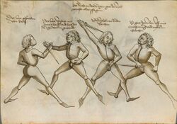During this time, the dagger was often employed in the role of a secondary defense weapon in close combat. The knightly dagger evolved into the larger baselard knife in the 14th century. During the 14th century, it became fairly common for knights to fight on foot to strengthen the infantry defensive line. This necessitated more use of daggers. At Agincourt (1415) archers used them to dispatch dismounted knights by thrusting the narrow blades through helmet vents and other apertures.[33] The baselard was considered an intermediate between a short sword and a long dagger, and became popular also as a civilian weapon. Sloane MS. 2593 (c. 1400) records a song satirizing the use of oversized baselard knives as fashion accessories.[34] Weapons of this sort called anelace, somewhere between a large dagger and a short sword, were much in use in 14th century England as civilians' accoutrements, worn "suspended by a ring from the girdle".[35]