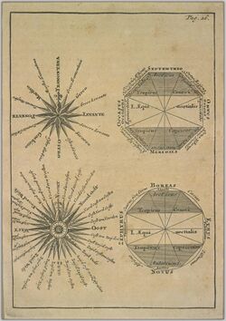 Before the development of the compass rose, a wind rose was included on maps in order to let the reader know which directions the 8 major winds (and sometimes 8 half-winds and 16 quarter-winds) blew within the plan view. No differentiation was made between cardinal directions and the winds which blew from those directions. North was depicted with a fleur de lis, while east was shown as a Christian cross to indicate the direction of Jerusalem from Europe.[1][2]