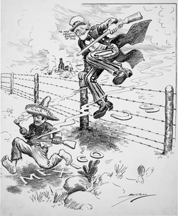 launched several attacks across the US-Mexico border, culminating in a violent raid on Columbus, New Mexico.[31] This provocation led Wilson in 1916 to prepare the US Army for an expedition into Mexico to hunt and kill Villa in retaliation for the raids.[32] The invasion was a logistical nightmare, and the few skirmishes actually fought between the US and Villa's forces were inconclusive at best.[33] Despite the American alliance with President Carranza, the invasion caused tensions between the two governments to skyrocket. Carranza's forces began teaming up with Villa's to push out the Americans. This show of universal hostility finally convinced America's generals to order a withdrawal from Mexico.[34]