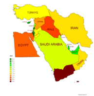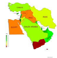 From Handwiki The Demographics of the Middle East describes populations of the Middle East, a region covering western and northern parts of the Asian and African continents respectively.