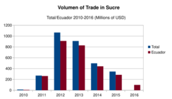 Transactions in Sucre. The graph shows the evolution of trade using the Sucre 2010–2016. Data for the trade volume between all participants are from the Informe de Gestión 2015. Data for Ecuador from the Central Bank of Ecuador.