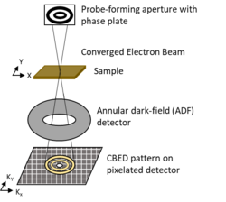 This technique MIDI-STEM (matched illumination and detector interferometry-STEM), while being less common, is used with ptychography to create higher contrast phase images. The placement of a phase plate with zones of 0 and π/2 phase shift in the probe forming aperture creates a series of concentric rings in the resulting CBED pattern. The difference in counts between the 0 and π/2 regions allows for direct measurement of local sample phase.[39] The counts in the different regions could be measured via complex standard detector geometries or the use of a pixelated detector in 4D STEM. Pixelated detectors have been shown to utilize this technique with atomic resolution.[40]