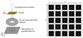 From Handwiki 4D scanning transmission electron microscopy (4D STEM) is a subset of scanning transmission electron microscopy (STEM) which utilizes a pixelated electron detector to capture a convergent beam electron diffraction (CBED) pattern at each scan location. This technique captures a 2 dimensional reciprocal space image associated with each scan point as the beam rasters across a 2 dimensional region in real space, hence the name 4D STEM. Its development was enabled by evolution in STEM detectors and improvements computational power. The technique has applications in visual diffraction imaging, phase orientation and strain mapping, phase contrast analysis, among others. The name 4D STEM is common in literature, however it is known by other names: 4D STEM EELS, ND STEM (N- since the number of dimensions could be higher than 4), position resolved diffraction (PRD), spatial resolved diffractometry, momentum-resolved STEM, "nanobeam precision electron diffraction", scanning electron nano diffraction, nanobeam electron diffraction, or pixelated STEM.[1]