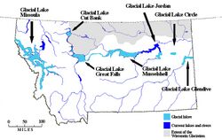 Lake Great Falls was a prehistoric proglacial lake which existed in what is now central Montana in the United States between 15,000 BCE and 11,000 BCE.[3][4][5] Centered on the modern city of Great Falls, Montana, Glacial Lake Great Falls extended as far north as Cut Bank, Montana, and as far south as Holter Lake.[6] At present-day Great Falls, the Glacial Lake Great Falls reached a depth of 600 feet (183 metres).[7]