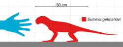 Suminia are diagnosed as a small Venyukoviid with various autapomorphies such as large orbit (almost 1/3 of the skull length), large teeth in relation to the skull size, reduced number of 23 presacral vertebrae, a more long than wide cervical vertebrae (suggests elongated neck), elongated limbs, manus and pes equal to ~40% of length of their respective limb, and enlarged distal carpal 1 and tarsal 1.[3]