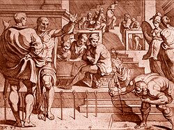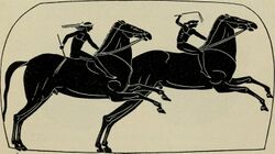In Aeneid 5, Aeneas organizes funeral games to commemorate the one-year anniversary of Anchises, the father of Aeneas.[29] Aeneas invited the best of the Trojans and the Sicilians to complete for prizes and wreaths. A trumpet blew to signal the start of the games.[30] For the first event, fans lined the beach to watch four crews of men race ships in the open water.[31] After praying to the gods of the sea, Cloanthus raced to the finish taking first place. Next, Aeneas and the large number of spectators gathered to watch a group of Sicilians and Trojans compete in a footrace that was eventually won by Euryalus.[32] Following the footrace, Dares and Entellus faced off in a heated boxing match. The match ended with Aeneas stepping to stop the fight and declaring Entellus the winner.[33] After boxing, the Sicilian King, Acestes, fired a magnificent arrow from his bow to win the archery competition.[34] In the final event, male youths competed in an equestrian military exercise.[35][36]