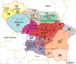 A variety of Germanic and major Slavic tribes crossed through Moravia during the Migration Period before Slavs established themselves in the 6th century AD. At the end of the 8th century, the Moravian Principality came into being in present-day south-eastern Moravia, Záhorie in south-western Slovakia and parts of Lower Austria. In 833 AD, this became the state of Great Moravia[26] with the conquest of the Principality of Nitra (present-day Slovakia). Their first king was Mojmír I (ruled 830–846). Louis the German invaded Moravia and replaced Mojmír I with his nephew Rastiz who became St. Rastislav.[27] St. Rastislav (846–870) tried to emancipate his land from the Carolingian influence, so he sent envoys to Rome to get missionaries to come. When Rome refused he turned to Constantinople to the Byzantine emperor Michael. The result was the mission of Saints Cyril and Methodius who translated liturgical books into Slavonic, which had lately been elevated by the Pope to the same level as Latin and Greek. Methodius became the first Moravian archbishop, the first archbishop in Slavic world, but after his death the German influence again prevailed and the disciples of Methodius were forced to flee. Great Moravia reached its greatest territorial extent in the 890s under Svatopluk I. At this time, the empire encompassed the territory of the present-day Czech Republic and Slovakia, the western part of present Hungary (Pannonia), as well as Lusatia in present-day Germany and Silesia and the upper Vistula basin in southern Poland . After Svatopluk's death in 895, the Bohemian princes defected to become vassals of the East Frankish ruler Arnulf of Carinthia, and the Moravian state ceased to exist after being overrun by invading Magyars in 907.[28][29]
