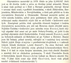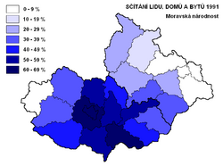 The Moravians are generally a Slavic ethnic group who speak various (generally more archaic) dialects of Czech. Before the expulsion of Germans from Moravia the Moravian German minority also referred to themselves as "Moravians" (Mährer). Those expelled and their descendants continue to identify as Moravian. [47] Some Moravians assert that Moravian is a language distinct from Czech; however, their position is not widely supported by academics and the public.[48][49][50][51] Some Moravians identify as an ethnically distinct group; the majority consider themselves to be ethnically Czech. In the census of 1991 (the first census in history in which respondents were allowed to claim Moravian nationality), 1,362,000 (13.2%) of the Czech population identified as being of Moravian nationality (or ethnicity). In some parts of Moravia (mostly in the centre and south), majority of the population identified as Moravians, rather than Czechs. In the census of 2001, the number of Moravians had decreased to 380,000 (3.7% of the country's population).[52] In the census of 2011, this number rose to 522,474 (4.9% of the Czech population).[53][54]