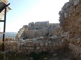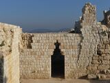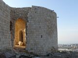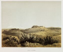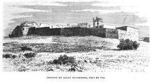 "This castle, which is said to date only from Dhaher el-A'mer, is currently in ruins. Built on a high plateau, from where we enjoy a very wide view, it is surrounded by an enclosure that flank from distance to distance semicircular towers, built, like the enclosure itself, with regular parts, but of dimensions mediocre, except for the lower course, which, arranged in an embankment, generally consist of larger blocks of ancient appearance. The interior was divided into two parts: one to the north, where the pasha resided, and the other to the south, which contained about sixty private dwellings. These are, for the most part, half overturned. The same is true of the serais or chateau proper, some rooms of which are currently used as cattle stables. The divan room was adorned with several monolithic columns of gray granite, raised to some ancient monument. Near there, an oualy still standing with its white dome and its minaret is dedicated to Neby Chema'oun es-Safa. A beautiful cistern adjoins it. Some Métualis families have taken up residence in the midst of these ruins.[20]