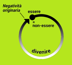The positivity of the historical determinations is thus reconciled with the original negativity of the self-concept, or self-consciousness of the determined concept. The act of the spirit is "original negativity" in that it is fulfilled at the moment in which it denies being as nature (the simple "A" devoid of connections), that is, it denies something that does not exist (mistakenly believed to exist by naturalism), and in this denial it realizes itself. Pure being is nothing because it is not even that conceptual being posited by abstract thought which, although inactual, provides fuel for the logic of the concrete.[19]