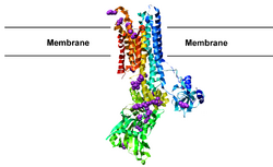 The crystal structure of the Na+/K+-ATPase with FHM2 mutations noted in purple: The N-terminus is colored blue and the C-terminus red. The approximate location of the cell membrane is noted. The original pdb file is available here.