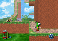 The difficulties of adapting platform gameplay to three dimensions led some developers to compromise by pairing the visual flash of 3D with traditional 2D side scrolling gameplay. These games are often referred to as 2.5D.[63] The first such game was the Sega Saturn launch title, Clockwork Knight (1994). The game featured levels and boss characters rendered in 3D, but retained 2D gameplay and used pre-rendered 2D sprites for regular characters, similar to Donkey Kong Country. Its sequel improved upon its design, featuring some 3D effects such as hopping between the foreground and background, and the camera panning and curving around corners. Meanwhile, Pandemonium and Klonoa brought the 2.5D style to the PlayStation. In a break from the past, the Nintendo 64 had the fewest side scrolling platformers with only four; Yoshi's Story, Kirby 64, Goemon's Great Adventure, and Mischief Makers—and most met with a tepid response from critics at the time.[64][65] Despite this, Yoshi's Story sold over a million copies in the US,[66] and Mischief Makers rode high on the charts in the months following its release.[67][68]