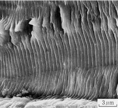 Small striations can be seen with the aid of a scanning electron microscope.[5] Once the size of a striation is over 500 nm (resolving wavelength of light), they can be seen with an optical microscope. The first image of striations was taken by Zapffe and Worden in 1951 using an optical microscope.[1]