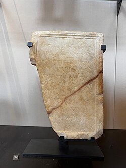 Politically, he engaged in the eastern Mediterranean, aiding Rome in the Macedonian Wars, sending troops to Greece, and supplying grain to Delos (which honored him).[35][37] Dubious of his intentions in the aftermath of the Macedonian wars, Rome rejected his request to visit the Senate and make a sacrifice in the Capitol.[38][39] Masinissa also maintained ties with Hellenistic monarchs such as Nicomedes II of Bithynia, while his sons received their education in Greece, probably Athens.