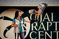 A trained red-tailed hawk working with a volunteer from the Ojai Raptor Center