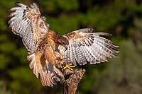 The diet of red-tailed hawks is highly variable and reflects their status as opportunistic generalists, but in North America, they are most often predators of small mammals such as rodents. Prey that is terrestrial and diurnal is preferred, so types such as ground squirrels are preferred where they naturally occur.[8] Large numbers of birds and reptiles can occur in the diet in several areas, and can even be the primary foods. Meanwhile, amphibians, fish and invertebrates can seem rare in the hawk’s regular diet, but they are not infrequently taken by immature hawks. Red-tailed hawks may survive on islands absent of native mammals on diets variously including invertebrates such as crabs, lizards, or birds. Like many Buteo species, they hunt from a perch most often, but can vary their hunting techniques where prey and habitat demand it.[5][9] Because they are so common and easily trained as capable hunters, the most hawks captured for falconry in the United States are red-tails. Falconers are permitted to take only passage hawks (which have left the nest, are on their own, but are less than a year old) so as to not affect the breeding population. Adults, which may be breeding or rearing chicks, may not be taken for falconry purposes, and doing so is illegal. Passage red-tailed hawks are also preferred by falconers because these younger birds have not yet developed the adult behaviors that would make them more difficult to train.[10]
