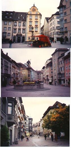 The Reformation was adopted, initially, in 1524 and completely in 1529. The town was heavily damaged during the Thirty Years' War by the passage of Swedish (Protestant) and Bavarian (Roman Catholic) troops and the very important bridge was burnt down. It was not until the early 19th century that the arrested industrial development of the town recommenced.[4] In 1857, the first railroad, the Rheinfallbahn, running from Winterthur, reached Schaffhausen.[6]