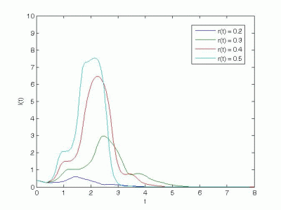 Following is a brief description of the manner in which this problem can be solved. As the description suggests, considerable dexterity may be required to solve a realistic system of delay differential equations. The solution of this problem involves three solution phases. Three delay differential equations are solved in each phase, one for \( \tau'(t) \ ,\) one for \( S'(t) \ ,\) and one for the accumulated dosage. The accumulated dosage \( y_3(t) \) is obtained by solving the equation \[ y_3'(t) = \rho(t) I_0(t) . \] Three additional delay functions, \( t-1 \ ,\) \( \tau(t) \ ,\) and \( \tau(t) - \sigma \ ,\) can be used to facilitate interpolations that must be performed during the different phases of the solution. During the first phase of the integration, \( \tau'(t) = 0 \ .\) A solution dependent event function \( g(t) = y_3(t) - m \) may be used to locate the threshold time \( t_0 \ ,\) i.e., the time \( t_0 \) for which \( y_3(t_0) = m \ .\) Once \( t_0 \) is located, the relevant equations for the second phase of the solution can be solved. The event function is changed to \( g(t) = t - (t_0 + \sigma) \ .\) This allows the program to locate \( t_0 + \sigma \) as an event. Once the second event is located, the full set of equations can be integrated to the desired final time of \( t = 8 \ .\) Two examples are considered in the paper. For the first example, \( \rho(t) = 1 \) and \( r(t) = r_0 \ .\) For the second example, \( \rho(t) = e^{-t} \) and \( r(t) = r_0 (1 + \sin(5t)) \ .\) Plots of \( S(t) \) and \( I(t) \) are given for several values of the parameter \( r_0 \ .\) To obtain these graphs, the problem is solved for each value of \( r_0 \ .\) Plots of the solutions thus obtained are displayed in Figures 1 and 2; they replicate those given in the paper.
