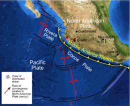 The Rivera Plate is a small tectonic plate (a microplate) located off the west coast of Mexico, just south of the Baja California Peninsula. It is bounded on the northwest by the East Pacific Rise, on the southwest by the Rivera Transform Fault, on the southeast by a deformation zone, and on the northeast by the Middle America Trench and another deformation zone.