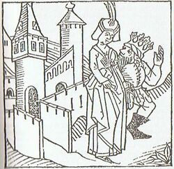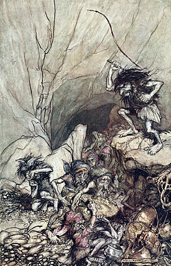 Alberich plays a prominent role in the Nibelungenlied, where he is the guardian of the Nibelung's treasure and has the strength of twelve men. Siegfried overpowers him using his cloak of invisibility (Tarnkappe), after which the dwarf serves the hero. Siegfried later pulls his beard in mock combat when he arrives unannounced to claim the treasure.[2] Ortnit seeks to woo the daughter of the heathen king Machorel, Alberich reveals his paternity to Ortnit and aids him in his quest, playing tricks on the heathen king and even impersonating Mohammed. When Ortnit sets out on his final fatal adventure against a plague of dragons, Alberich takes back the magic ring and warns Ortnit not to go on his quest.[2]