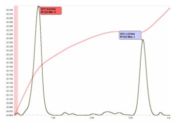 An excellent application is the sequential determination of calcium and magnesium. Although calcium reacts exothermically with EDTA (heat of chelation ~-23.4 kJ/mol), magnesium reacts endothermically with a heat of chelation of ~+20.1 kJ/mol. This is illustrated in the titration plot of EDTA with calcium and magnesium in sea water (Figure 14). Following the solution temperature curve, the breakpoint for the calcium content (red-tagged endpoint) is followed by a region of modest temperature rise due to competition between the heats of dilution of the titrant with the solution, and the endothermic reaction of Mg2+ and EDTA. The breakpoint for the consumption of Mg2+ (blue-tagged endpoint) by EDTA is revealed by upswing in temperature caused purely by the heat of dilution.