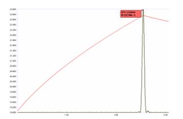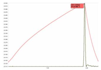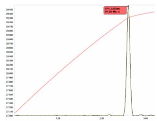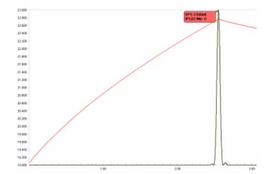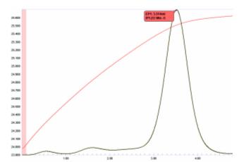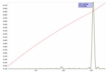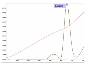 Thermistors respond quickly to small changes in temperature such as temperature gradients in the mixed titration solution, and thus the signal can exhibit a small amount of noise. Prior to derivatization it is therefore necessary to digitally smooth (or "filter") the temperature curve in order to obtain sharp, symmetrical second derivative "peaks" which will accurately locate the correct inflection point. This is illustrated in Figure 5. The degree of digital smoothing is optimized for each determination, and is stored as a method parameter for application every time a titration for that particular analysis is run.