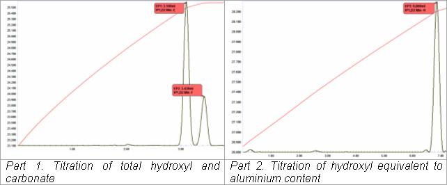 The thermometric titrimetric analysis of sodium aluminate liquor ("Bayer liquor") in the production of alumina from bauxite is accomplished in an automated two titration sequence. This is an adaptation of a classic thermometric titration application (VanDalen and Ward, 1973). In the first titration, tartrate solution is added to an aliquot of liquor to complex aluminate, releasing one mole of hydroxyl for each mole of aluminate present. This is titrated acidimetrically along with "free" hydroxyl present and the carbonate content (as a second endpoint). The second titration is preceded by the automatic addition of fluoride solution. The alumina-tartrate complex is broken in favour of the formation of an aluminium fluoride complex and the concomitant release of three moles of hydroxyl for each mole of aluminium present, which are then titrated acidimetrically. The whole determination can be completed in less than 5 minutes.