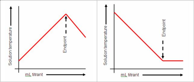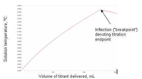 In the thermometric titration, titrant is added at a known constant rate to a titrand until the completion of the reaction is indicated by a change in temperature. The endpoint is determined by an inflection in the curve generated by the output of a temperature measuring device.