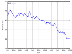 The graph shows the value of the euro in korunas from 1999 to December 2008. As may be seen, the currency strengthened as Slovakia's economy did. The koruna joined the ERM II on 28 November 2005 at the rate of € = 38.4550 Sk with a 15% band.[3][4] On 17 March 2007, this rate was readjusted to 35.4424 Sk with the same band, an 8.5% increase in the value of the koruna.[5] On the same day, 1 euro traded at 33.959 Sk. The central rate of koruna was then adjusted once more on 28 May 2008 to 33.8545 with no change in the band.[6]
