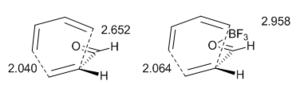 The catalyzed Diels-Alder reaction is believed to be concerted. A computational study at the B3LYP/6-31G(d) level has shown, however, that the transition state of the BF3-catalyzed Diels-Alder reaction between propenal and 1,3-butadiene is more asynchronous than that of the thermal reaction – the bond further from the carbonyl group is formed ahead of the other bond.[26]
