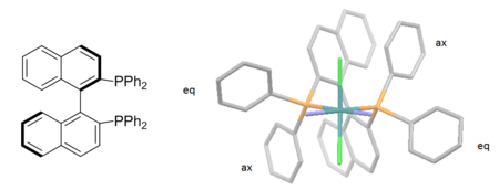 Developed by Noyori, BINAP (2,2'-diphenylphosphino-1,1'-binaphthyl) is a family of chiral diphosphine ligands featuring two triarylphosphine moieties installed on a binaphthalene backbone.[54] BINAP chelates onto a metal (usually a late transition metal) to form a C2-symmetric complex. As shown below in the structure of an (R)-BINAP ruthenium complex,[55] among the four remaining coordination sites on an octahedral metal center, the two equatorial sites (purple) are strongly influenced by the equatorial phenyl groups, while the two axial sites (green) are influenced by the axial phenyl groups.