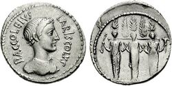 The Roman goddess Diana was venerated from the late sixth century BC as diva triformis, "three-form goddess",[15] and early on was conflated with the similarly depicted Greek goddess Hekate.[16] Andreas Alföldi interpreted a late Republican numismatic image as Diana "conceived as a threefold unity of the divine huntress, the Moon goddess and the goddess of the nether world, Hekate".[17] This coin shows that the triple goddess cult image still stood in the lucus of Nemi in 43 BC. The Lake of Nemi was Triviae lacus for Virgil (Aeneid 7.516), while Horace called Diana montium custos nemoremque virgo ("keeper of the mountains and virgin of Nemi") and diva triformis ("three-form goddess").[15] In his commentary on Virgil, Maurus Servius Honoratus said that the same goddess was called Luna in heaven, Diana on earth, and Proserpina in hell.[18]