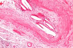 | Micrograph showing a cholesterol embolus in a medium sized artery of the kidney. Kidney biopsy. H&E stain. | |