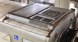 Rooftop condenser unit fitted on top of an Osaka Municipal Subway 10 series subway carriage (April 2008)
