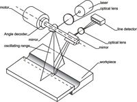 The distance of the workpiece is determined from the known dimensions of the sensor and the triangulation angle α. This type of one-dimensional optical distance measurement systems is widely used in the field of industrial automation technique and is therefore offered by many companies. In automated welding, they are often used for the detection of the part and/or groove position before the start of the welding process. There are different types of design of the two-dimensionally measuring sensor systems. From the 1D triangulation sensor, the two-dimensional laser scanner can be derived from the oscillation movement. Here, the groove geometry is detected via a scanning movement transverse to the groove (Figure 5). This is mainly carried out via a movable mirror unit which is integrated in the sensor head.