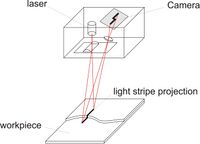 As an alternative, an oscillating movement of the entire sensor head can be carried out, this is, however, only considered a special application of a one-dimensionally measuring system. An advantage of the laser scanner is that, with according processing speed, the lighting conditions can be adapted for every single point-shaped distance measurement which results in illumination uniformity. Moreover, due to the point-shaped illumination, the laser point is through the concentrated laser power and also through appropriate optical filters, compared with the interfering arc radiation, easier to detect by the detection element. The light-section sensor avoids the disadvantage of moving parts in the sensor head (Figure 6). Here, the surface is not scanned pointwise, the entire geometry is, moreover, captured in one image. For this purpose, the point-shaped laser beam is expanded via an optics to a line which is projected onto the surface of the workpiece transverse to the groove in accordance with the scan line of the scanner. The laser line is, in accordance with the same geometrical principle of triangulation, again acquired with a detector element, this time, however, two-dimensionally. For the acquisition, CCD and CMOS cameras with the above-mentioned properties can be used.