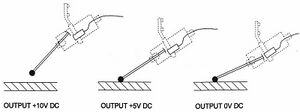 Due to the required distance of the acting/break points in one level, transformers which are equipped with micro-switches have a control hysteresis in the working point which has the consequence of a restricted reproducible accuracy. Electric displacement of the working point is not possible. The other, above-mentioned transformer systems (the use of optical systems is probably limited due to design reasons) produce analogous signals in proportion to the scanning element deflection and allow thus the error-proportional weld head tracking and also the electric working point displacement through the superordinate control, e.g. in multiple layer welding. The output signals of the most commonly used inductive measuring transformer systems are between 0 and 10 V DC, depending on the scanning element deflection (Figure 2).