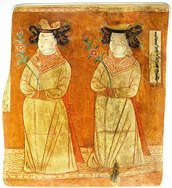 Professor James A. Millward described the original Uyghurs as physically Mongoloid, giving as an example the images in Bezeklik at temple 9 of the Uyghur patrons, until they began to mix with the Tarim Basin's eastern Iranian inhabitants.[14] Buddhist Uyghurs created the Bezeklik murals.[15]
