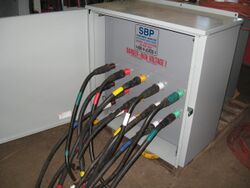 Trailer-mounted generators or mobile generators, diesel generators are also used for emergencies or backup where either a redundant system is required or no generator is on-site. To make the hookup faster and safer, a tie-in panel is frequently installed near the building switchgear that contains connectors such as camlocks. The tie-in panel may also contain a phase rotation indicator (for 3-phase systems) and a circuit breaker. Camlock connectors are rated for 400 amps up to 480-volt systems and used with 4/0 type W cable connecting to the generator. Tie-in panel designs are common between 200- and 3000-amp applications.