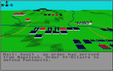 Rotating the map using a compass is essential for ensuring an army moves in the desired direction.[1] The order of a moving unit will not be carried out until the unit has reached its destination or if they have been killed before arriving there. Each order carried out is announced through the game's command box, which is situated at the bottom of the screen. Actions such as battles and unit losses are also announced.[1] In order to attack the enemy from a distance, the player is able to order a unit to commence shelling, which will neutralise an enemy unit if successful.[2] The game features no sound.[2][1]