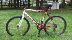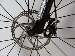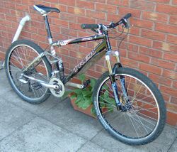 A mountain bike (MTB[1]) or mountain bicycle is a bicycle designed for off-road cycling. Mountain bikes share some similarities with other bicycles, but incorporate features designed to enhance durability and performance in rough terrain, which makes them heavier, more complex and less efficient on smooth surfaces.[2] These typically include a suspension fork, large knobby tires, more durable wheels, more powerful brakes, straight, extra wide handlebars to improve balance and comfort over rough terrain, and wide-ratio gearing optimised for topography, application (e.g., steep climbing or fast descending) and a frame with a suspension mechanism for the rear wheel. Rear suspension is ubiquitous in heavier-duty bikes and now common even in lighter bikes. Dropper posts can be installed to allow the rider to quickly adjust the seat height[3] (an elevated seat position is more effective for pedaling, but poses a hazard in aggressive maneuvers).