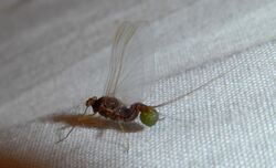 In other cases, errors may have been wrongly attributed to Aristotle.[18] Katrin Weigmann wrote "[Aristotle's] statement that flies have four legs was repeated in natural history texts for more than a thousand years despite the fact that a little counting would have proven otherwise."[19] However, the historian and philosopher of biology John S. Wilkins notes that Aristotle did not say "all flies have four legs"; he wrote that one particular animal, the ephemeron or mayfly, "moves with four feet and four wings: and, I may observe in passing, this creature is exceptional not only in regard to the duration of its existence, whence it receives its name, but also because though a quadruped it has wings also." Mayflies do in fact walk on four legs, the front pair not being adapted for walking, so, Wilkins concludes, Aristotle was correct.[18]