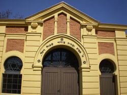 Biblical text on a synagogue in Holešov, Czech Republic: "Hashem (ה׳) kills and makes alive; He brings down to Sheol and raises up." (1 Samuel 2:6)