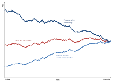 Note: In industry parlance, contango may refer to the situation when futures prices (or forward prices) are above the current spot price, or a far-dated futures price is above a near-dated futures price, and the expectation is for the spot price to rise to the futures price at maturity, or the near-dated futures price to rise to the far-dated futures price.[4][5]