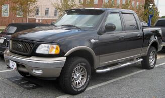 The new F-150 was Motor Trend magazine's Truck of the Year in 1997.[13] A minor facelift was introduced September 1998, with minor interior updates for 1999 models including a revised instrument cluster and a new door panel design to incorporate the 4th additional door. In February 2000, the SuperCrew was added to the lineup early in the 2001 MY (Model Year), entering production on December 13, 1999. Ford also manufactured a limited run of "Heritage" (differentiated from the 2003 "Heritage Edition") F-150s of the 2003 body style to August 2004 as 2004 models to finish out production.[14][15][16] The only change for 2004 models also had fully amber turn signal lenses on the headlamps, the SuperCrew body style was dropped, and the Lariat trim was dropped, leaving only XL and XLT.
