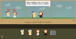 Storyteller is a puzzle game in which players form story narratives by placing characters and scenes into picture book styled panels. Depending on how the characters, scenes and panels are arranged, the story and character motivations adapt accordingly, affecting the outcome of subsequent panels. For example, if a character dies in one panel, they will appear as a ghost in later panels. Each puzzle has a descriptive title, with the player tasked with forming a story that matches the title using the provided characters and scenes within a set number of panels. For example, if the title calls for a character to drink poison, they must form a story in which said character will be motivated to drink it. Puzzles may have multiple solutions and certain puzzles have sub-objectives which require the story to fulfil additional criteria to clear.[5]