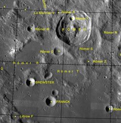 Franck Crater is to the south of the photo, to the north is Römer and its satellite craters with Römer T being the closest of it located north (Photo from the LRO)